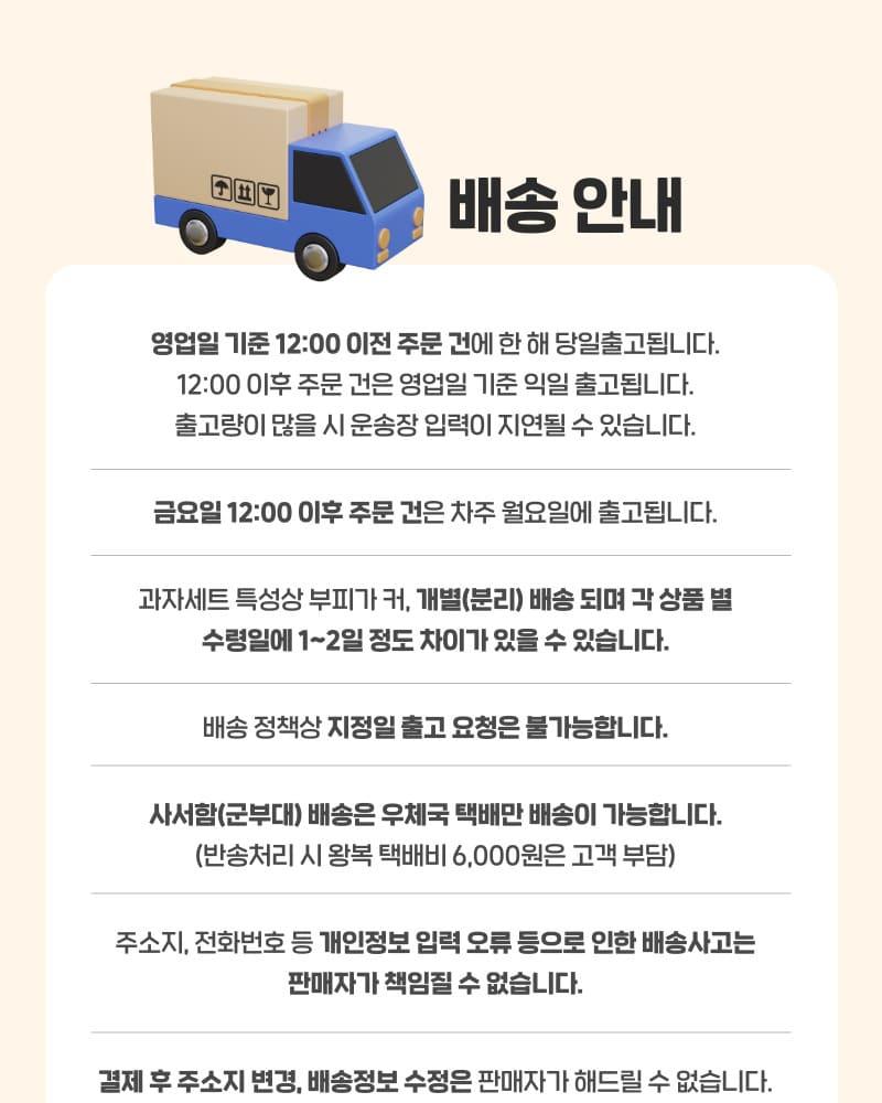 Delivery will be completed within an average of 3-5 business days from the date of payment and shipping information completion (excluding weekends and public holidays in Korea). The delivery time may be extended if there is a high volume of orders.If the delivered product is defective or incorrect, please contact the SodaGift Support Team (support@sodagift.com) within 7 days of delivery for a refund or exchange.