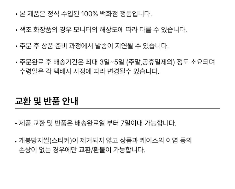 Delivery will be completed within an average of 3-5 business days from the date of payment and shipping information completion (excluding weekends and public holidays in Korea). The delivery time may be extended if there is a high volume of orders.If the delivered product is defective or incorrect, please contact the SodaGift Support Team (support@sodagift.com) within 7 days of delivery for a refund or exchange.