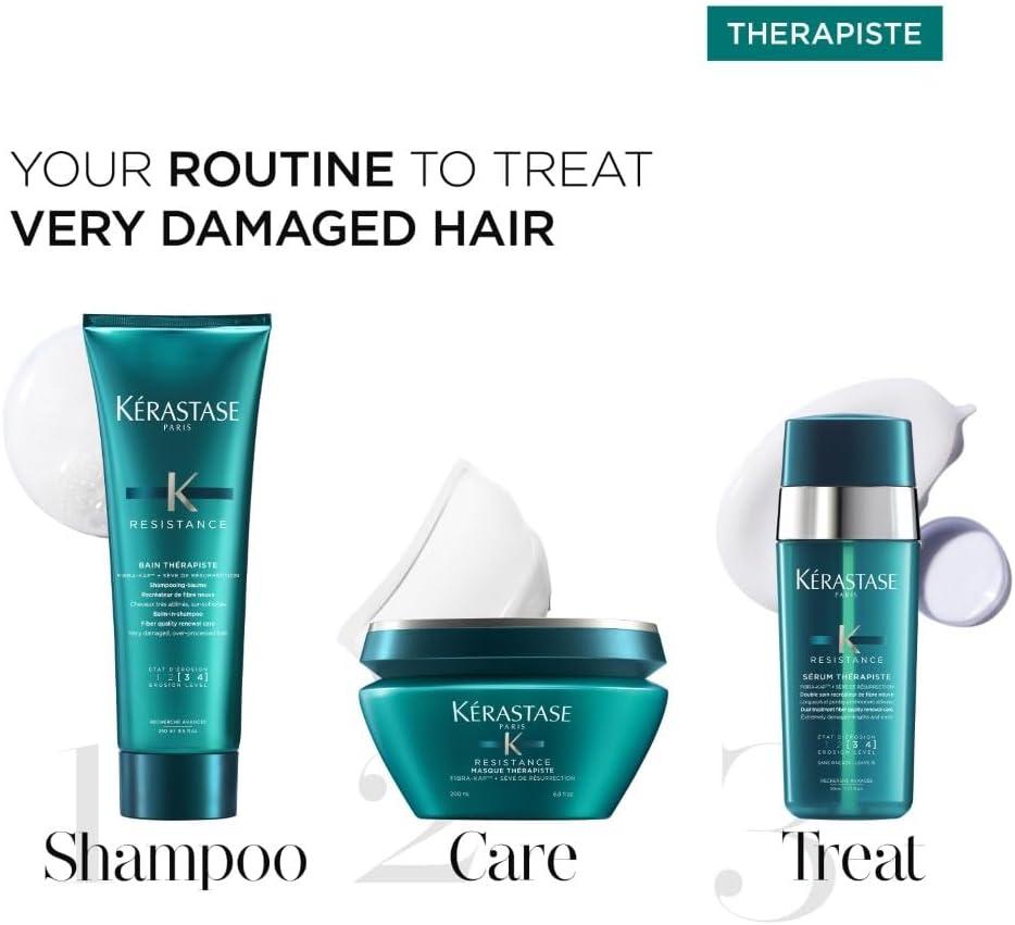 Resistance Therapiste is a strengthening range designed to repair split ends and brittleness. This 3-step ritual for very damaged hair (erosion level 3–4) includes the Bain Therapiste balm-in-shampoo, the Masque Therapiste repair mask and the Serum Therapiste dual hair fibre renewing treatment.