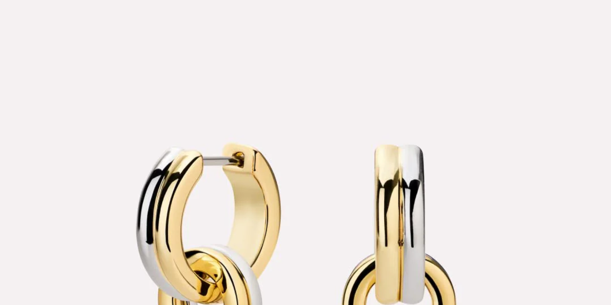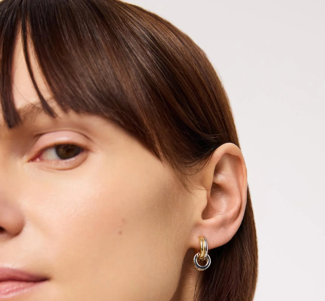 An elevated stack is easy to achieve with these huggie earrings. Plated in 14k gold and rhodium, these earrings feature a bold mixed metal design and interlocking silhouette that will always turn heads.