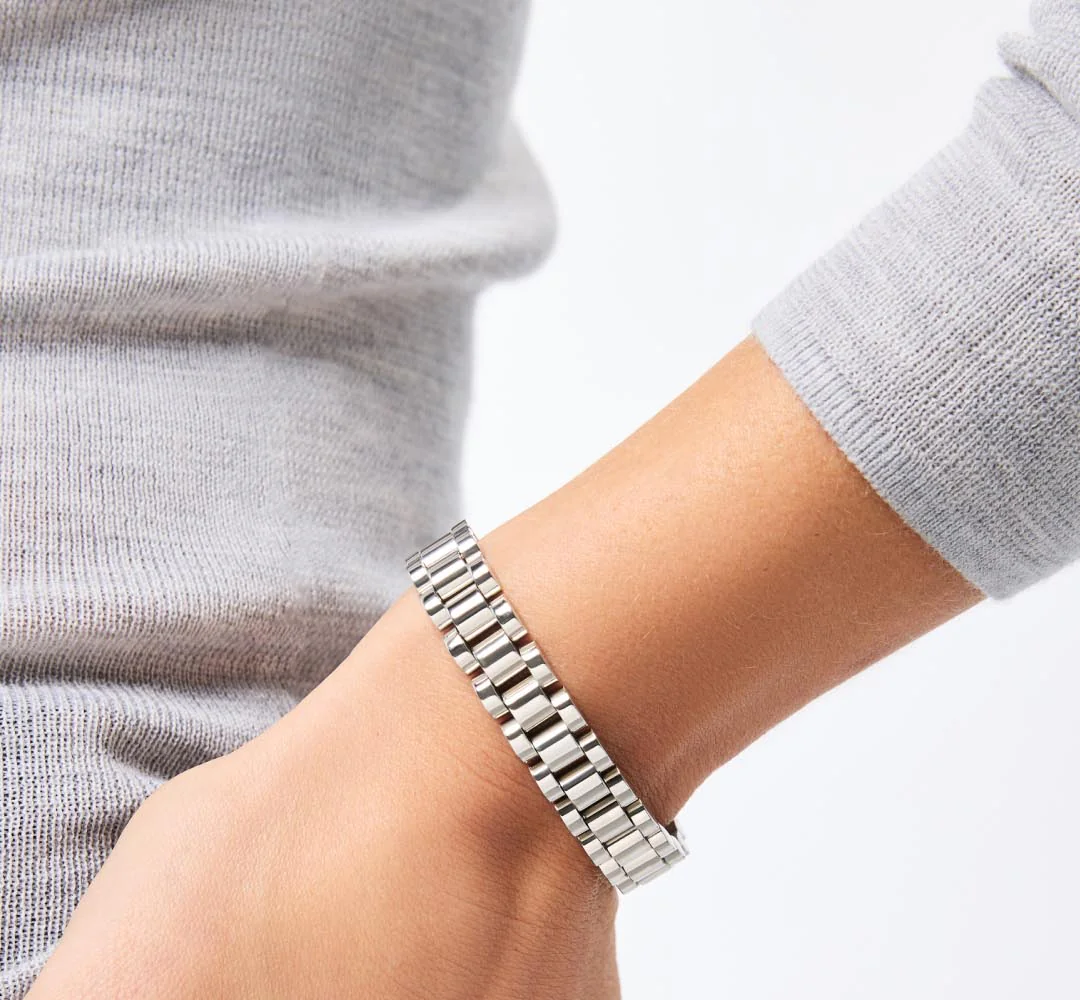 Timeless with a twist, the Ora Watch Strap Bracelet brings the elegance of classic watchbands to your everyday jewelry stack. Available in two finishes, rhodium-plated for a sleek silver tone or 14k gold-dipped stainless steel for a rich, golden glow, each bracelet features a smooth, linked design inspired by luxury timepieces. Whether worn solo or stacked with your favorite chains, this piece comes with extra links so you can tailor the fit to your wrist perfectly.