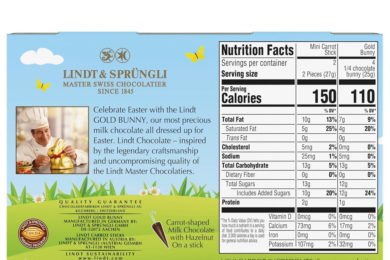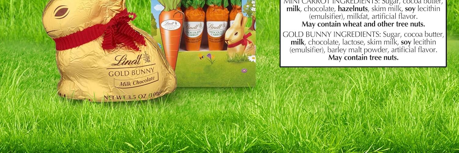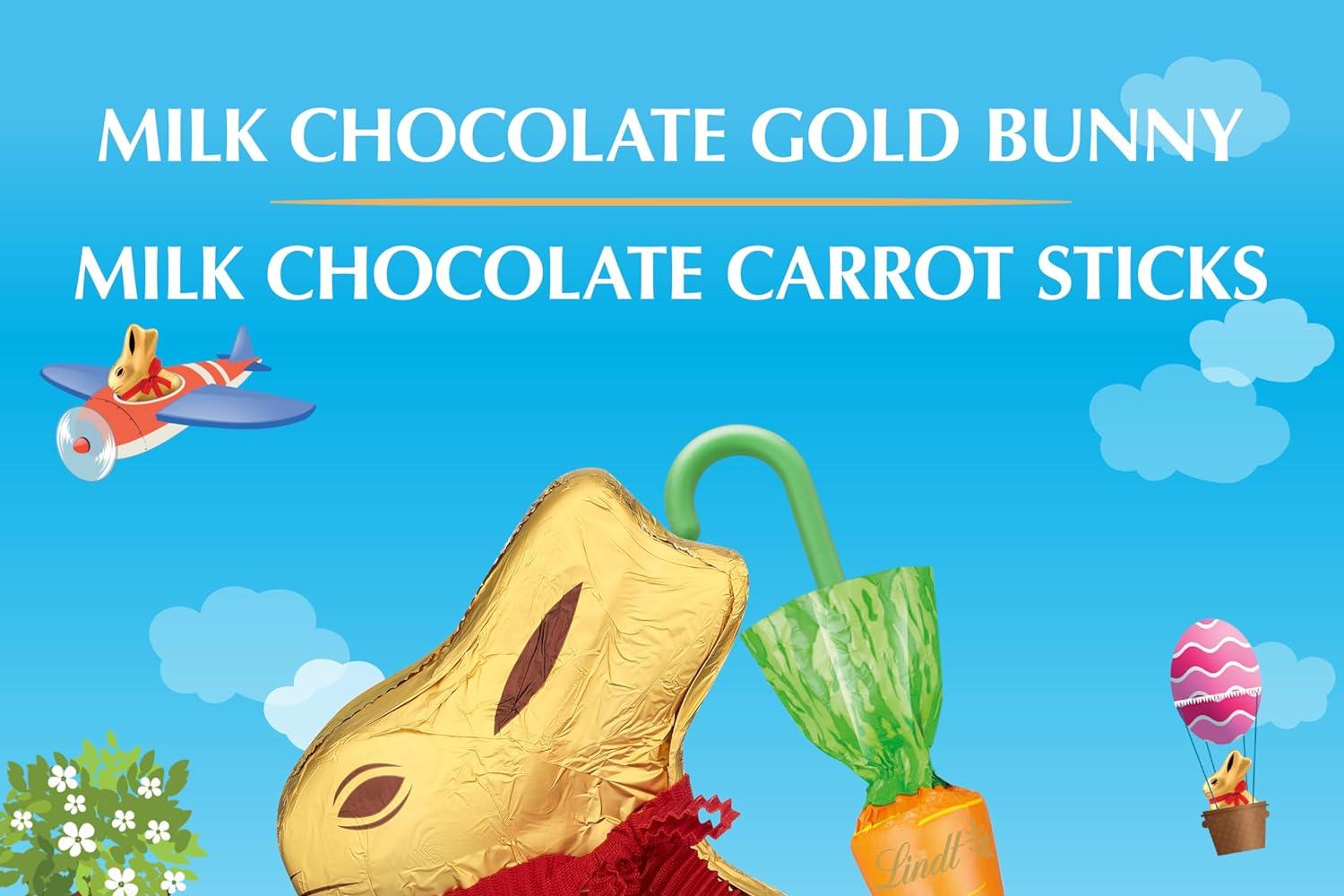• Includes one Lindt GOLD BUNNY Milk Chocolate and four Milk Chocolate with Hazelnut Carrot Sticks