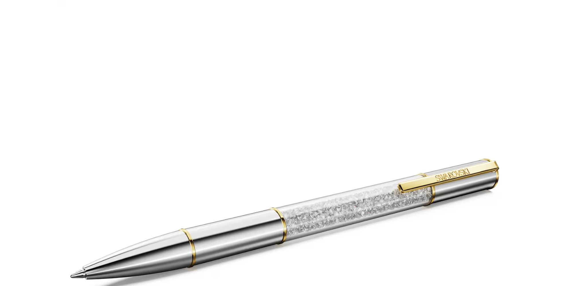 The Crystalline ballpoint pen combines creativity with luxury. This distinctive writing instrument features a round silver-tone barrel, as well as gold-tone accents that include a functional clip engraved with the Swarovski name. At its center, this eye-catching design is illuminated with approximately 480 glittering crystals, each meticulously added using the iconic Crystalline technique. A standout addition to your desk or a distinctive gift for the writers in your life.