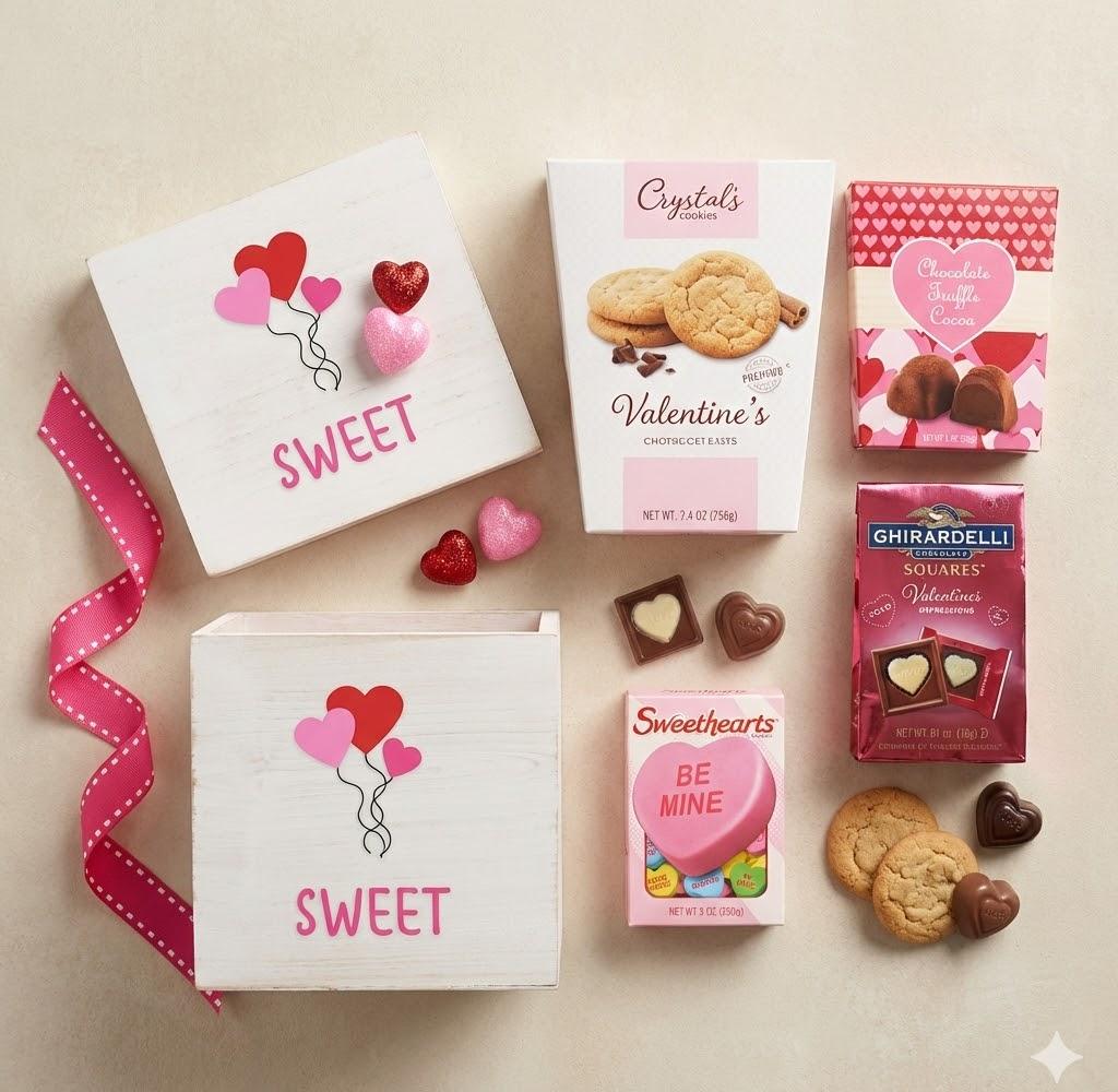 Share the sweetness this Valentine’s Day with a charming wooden gift box filled with cozy, classic treats your sweetheart will love—rich hot cocoa, soft snickerdoodle cookies, nostalgic conversation hearts, and smooth Ghirardelli chocolate squares. Simple, romantic, and memorable, it’s a thoughtful way to say you’re thinking of them.