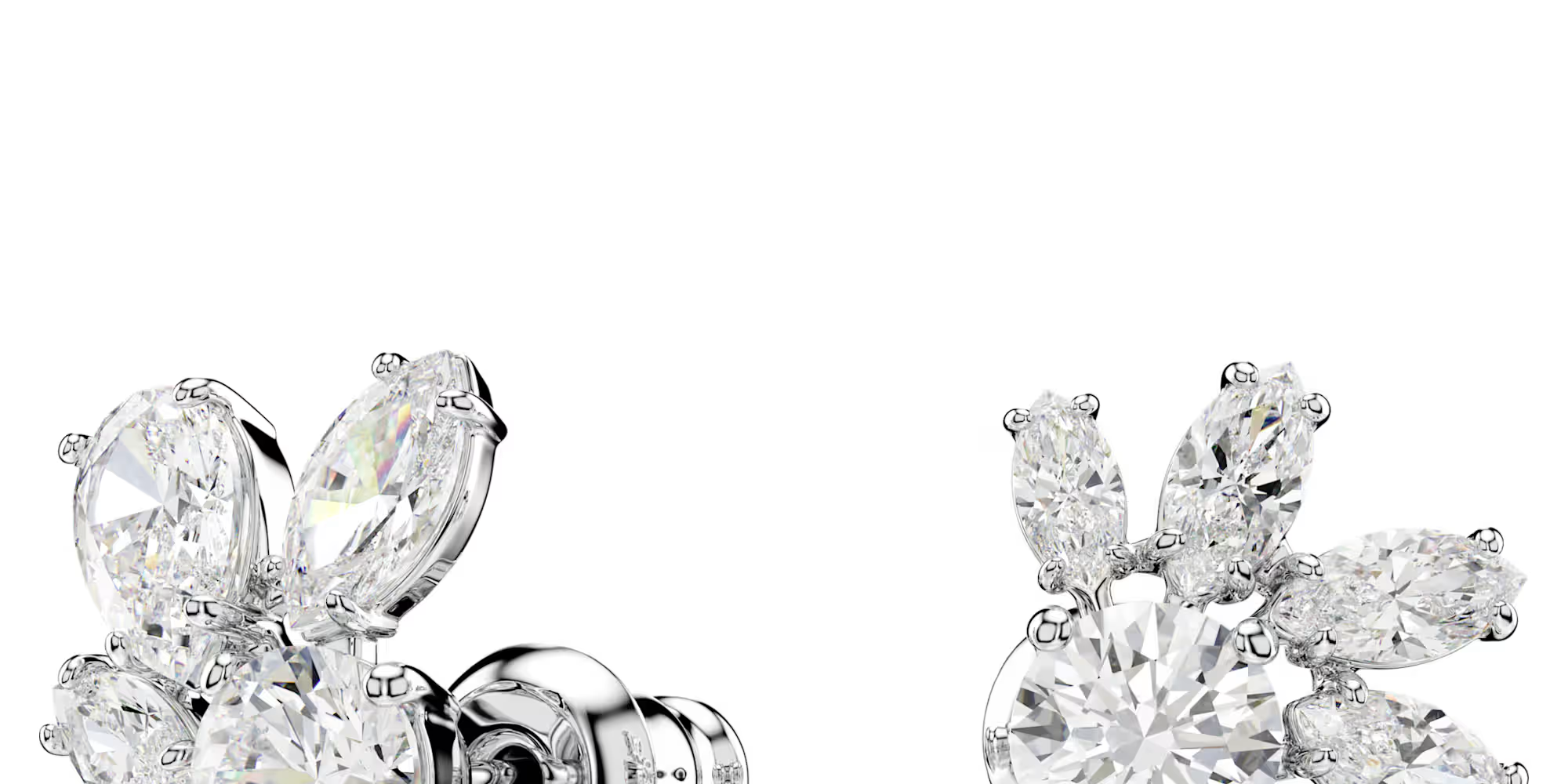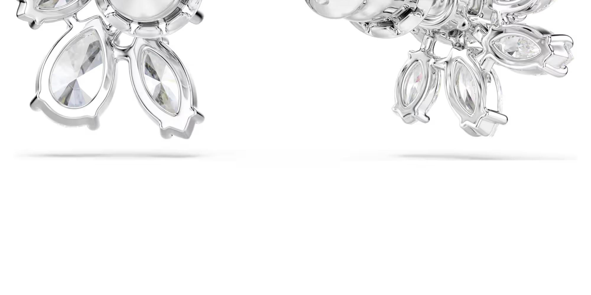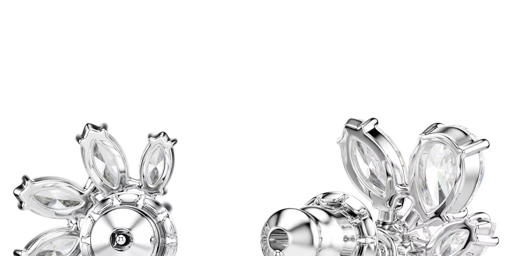 Two halves are better than one with these intriguing earrings. Designed with an artful mix of clear stones in a refined double prong setting with rhodium plating, each piece forms one half of a flower motif.