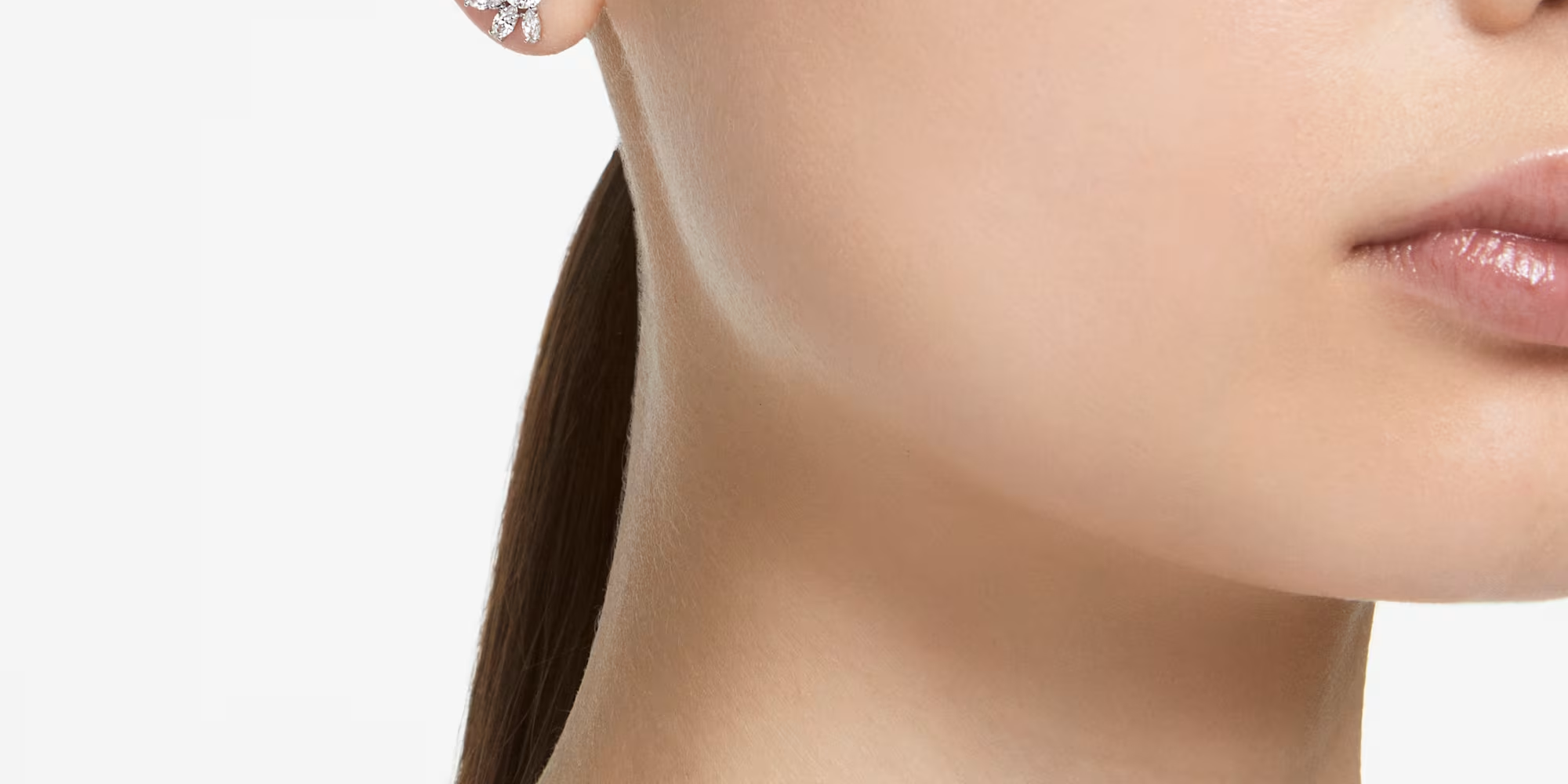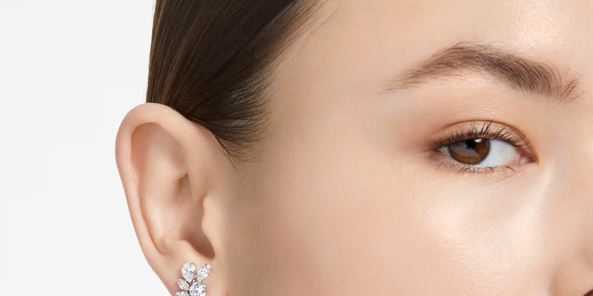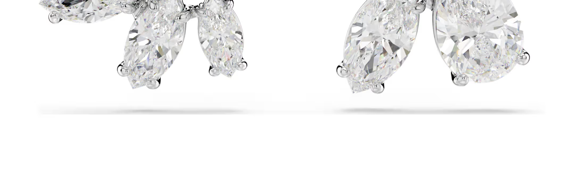 Two halves are better than one with these intriguing earrings. Designed with an artful mix of clear stones in a refined double prong setting with rhodium plating, each piece forms one half of a flower motif.