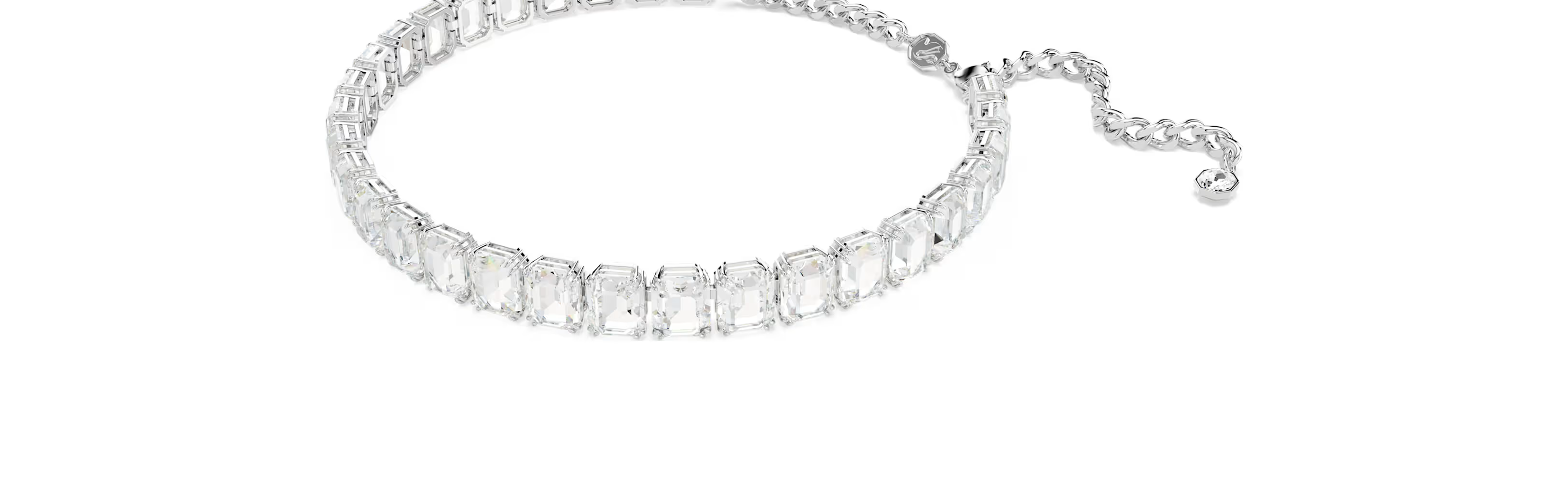 Made for everyday elegance, this glowing Millenia choker is infused with light. The design is crafted with rhodium plating and features a uniform row of clear octagon-cut crystals that deliver maximum radiance. Supercharge the effect of this choker by pairing it with a matching set of cascading earrings.