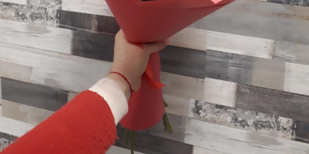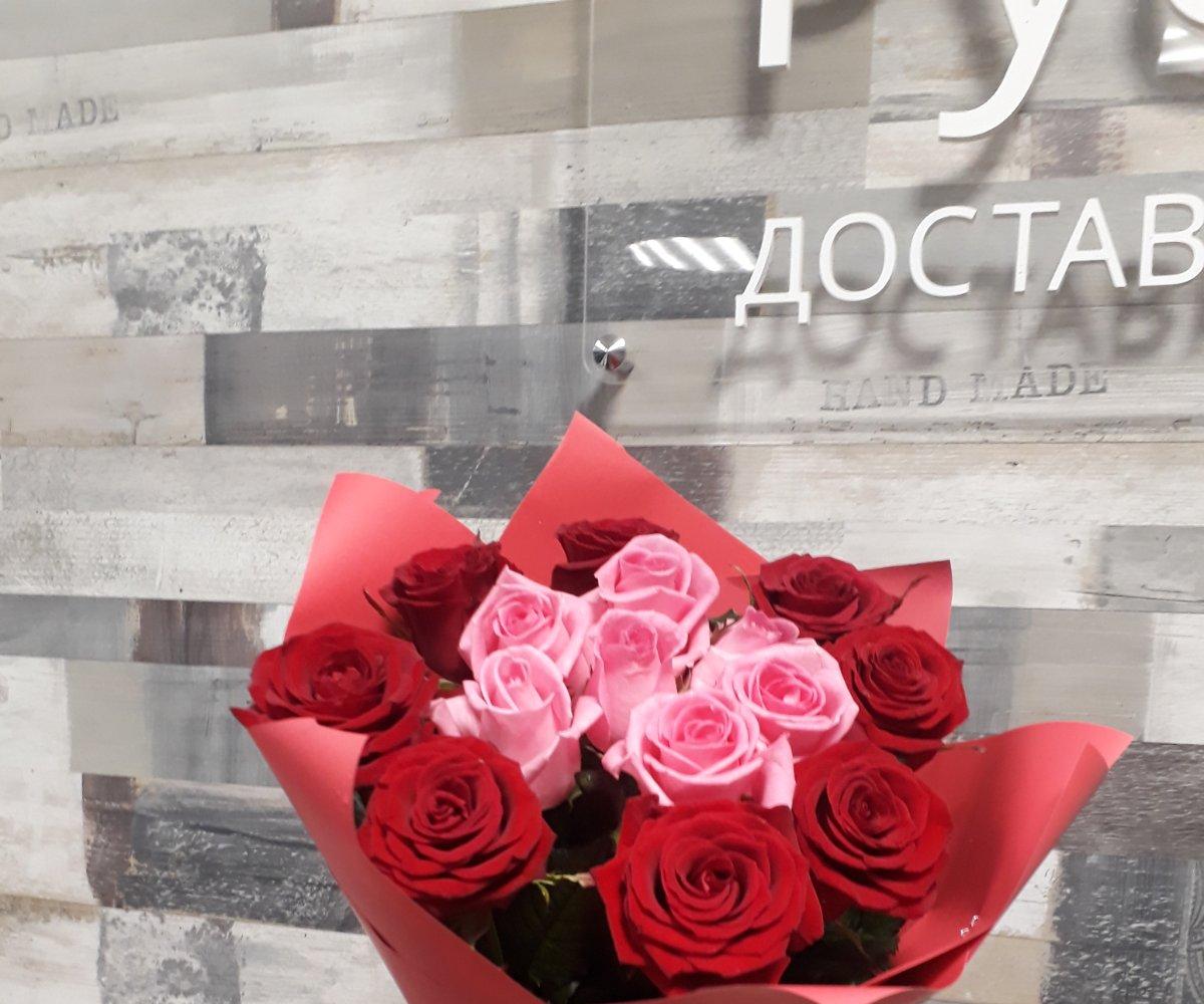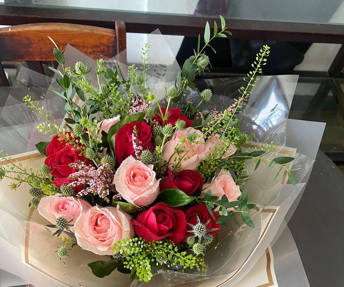- ピンクのバラ7本と赤いバラ8本のブーケ