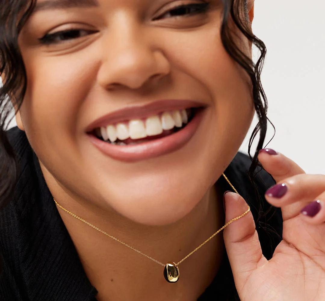 洗練されたチェーンと、光を美しく受ける独特な形のチャームで仕立てたミニペンダントネックレスが、日常の装いに彫刻的なアクセントを添えます。どんなネックラインにもほどよい質感と上品な艶を与える、汎用性の高いネックレスです。