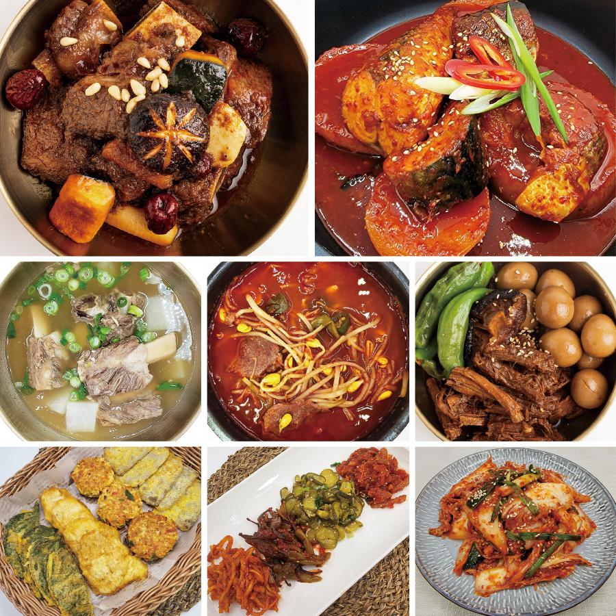 肉・魚のメインに、澄んだスープと辛味のあるスープ、チヂミや基本のおかずまで揃えた家庭料理のセットです。