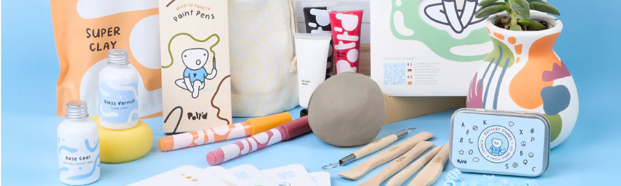 セット内容:ポッティッド スーパークレイ2袋、カスタム木製陶芸ツール5本、陶芸用スポンジ1個、プレミアムアクリルポッティッドペイント8色、アクリルポッティッドペイントペン8本、ポッティッドスタンプボックス1箱、アーティストブラシ2本、ベースコートと光沢バーニッシュ、クイックスタートガイド、説明書を立てかけるためのポッティッドイーゼル1個。