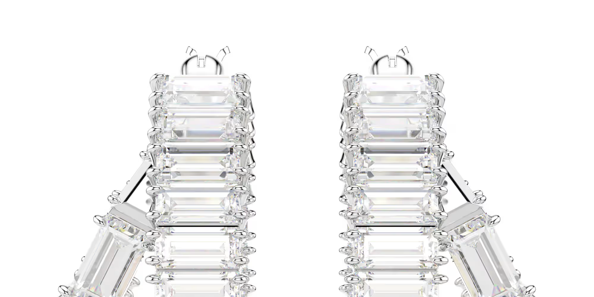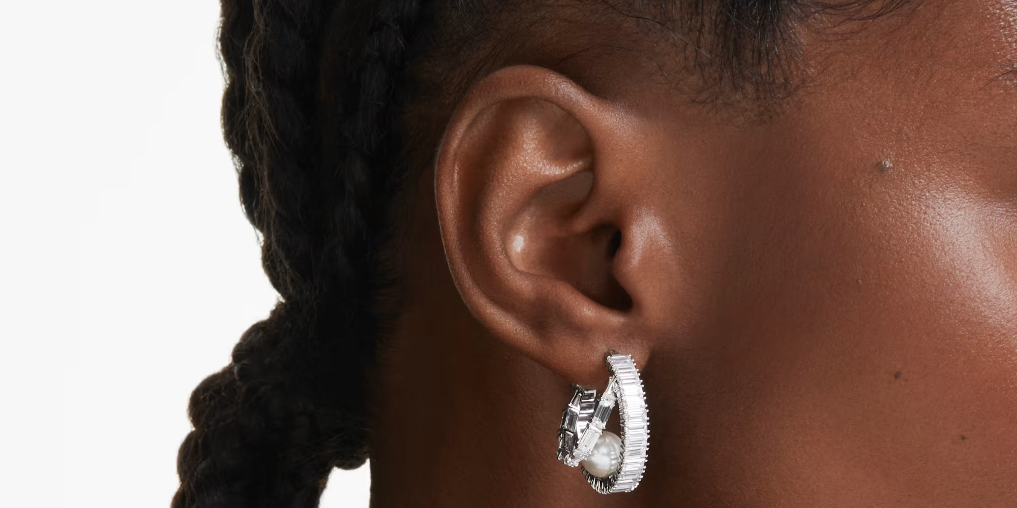 クラシックなフープスタイルにモダンなひねりを取り入れて。これらの輝くピアスはそれぞれロジウムコーティングが施され、バゲットカットのスワロフスキー・ジルコニアが一周ぐるりとセッティングされています。さらに各フープのベースにはスワロフスキー・クリスタルパールをひと粒配し、ラグジュアリーな印象をいっそう高めています。お揃いのジュエリーと合わせて、あなただけの表情豊かなコーディネートを楽しんで。