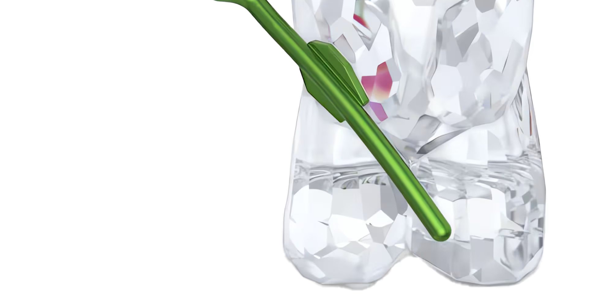 この愛らしい置物は、399面体のカットで仕上げられ、つややかな緑色の金属製の茎のピンクのバラを手にしています。