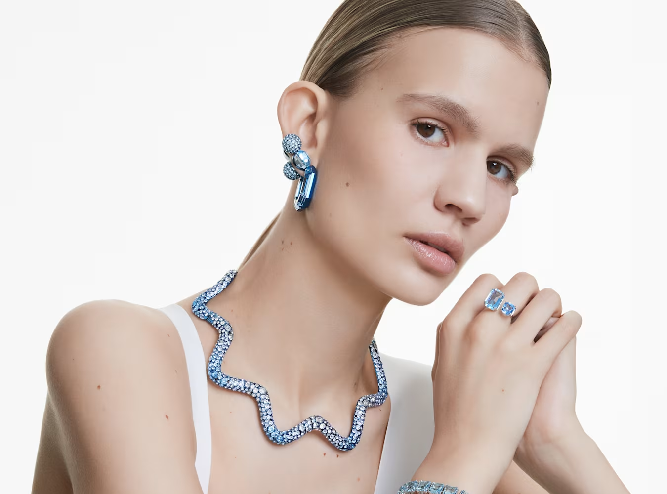 クリスタルがあしらわれた各ピースは、片面にカラーメタルを備え、さりげないポスト留めと開閉しやすいヒンジ機構を採用しています。