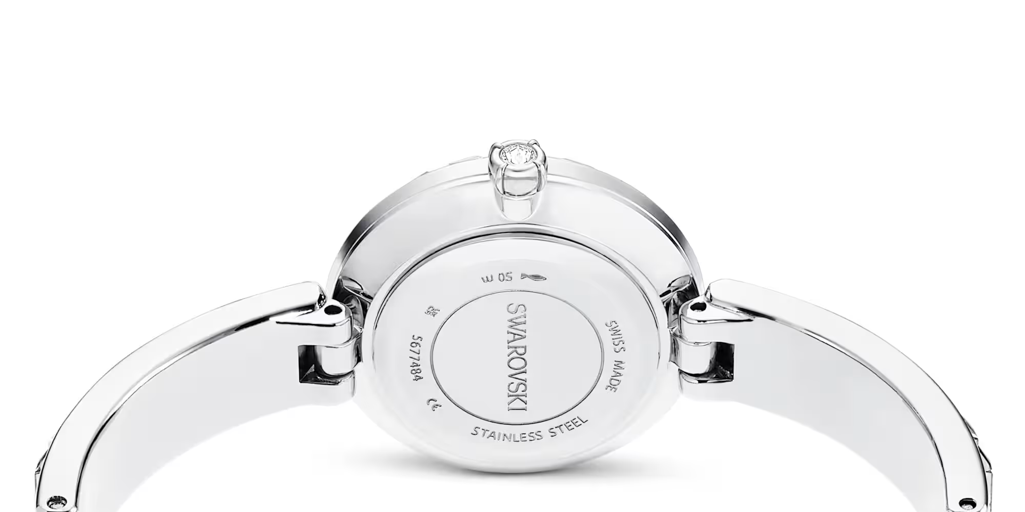 気品はクリスタルによっていっそう引き立つ、ジュエリーに着想を得た美しいタイムピース。直径25ミリメートルのステンレススチール製デザインは、20個のバゲットカットのカラークリスタルをあしらったベゼルに囲まれ、りゅうずには一粒のクリスタルをセッティング。バゲットカットのクリスタルはダイヤル上の3つのインデックスも際立たせ、12時位置にはスワンロゴを配している。