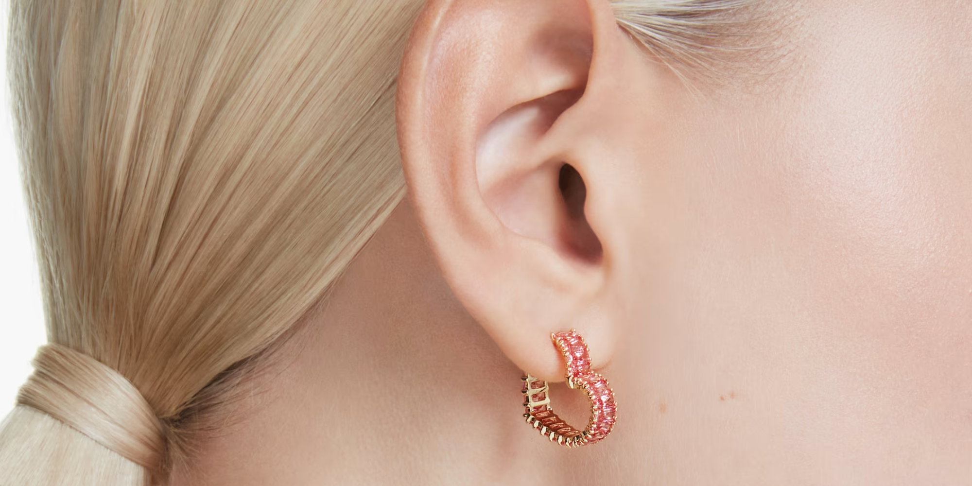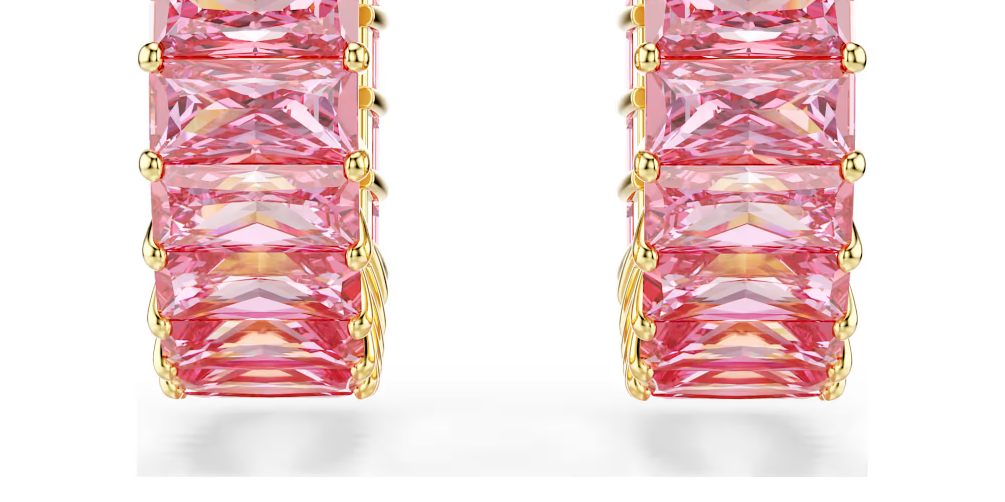 ロマンティックなハート型のピアスに恋してデザインはゴールドトーンのメッキ仕上げで、鮮やかなピンクのバゲットカットのスワロフスキージルコニアを全面にあしらっていますクラシックなフープを現代的で輝かしく表現したデザインです