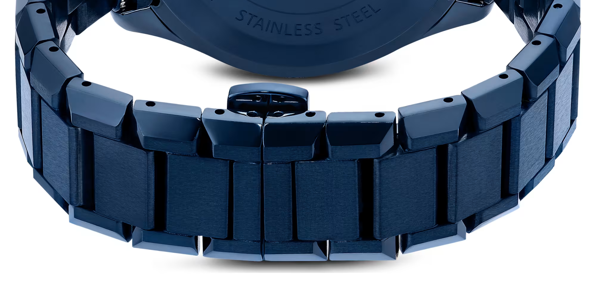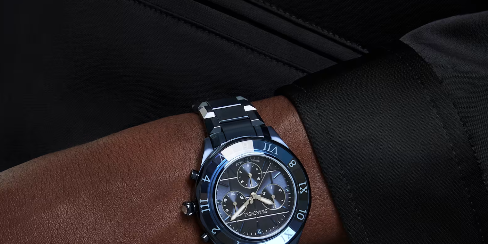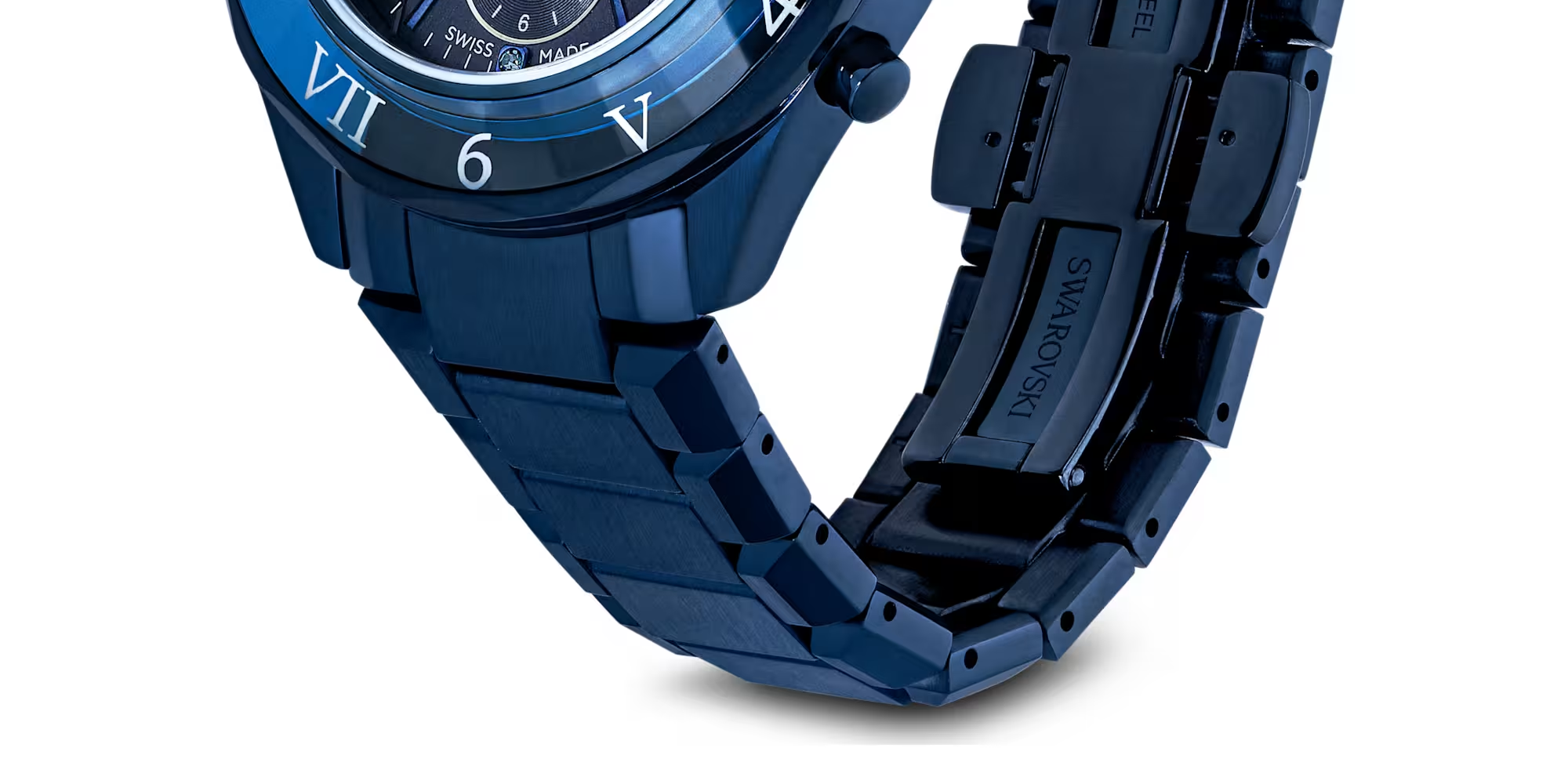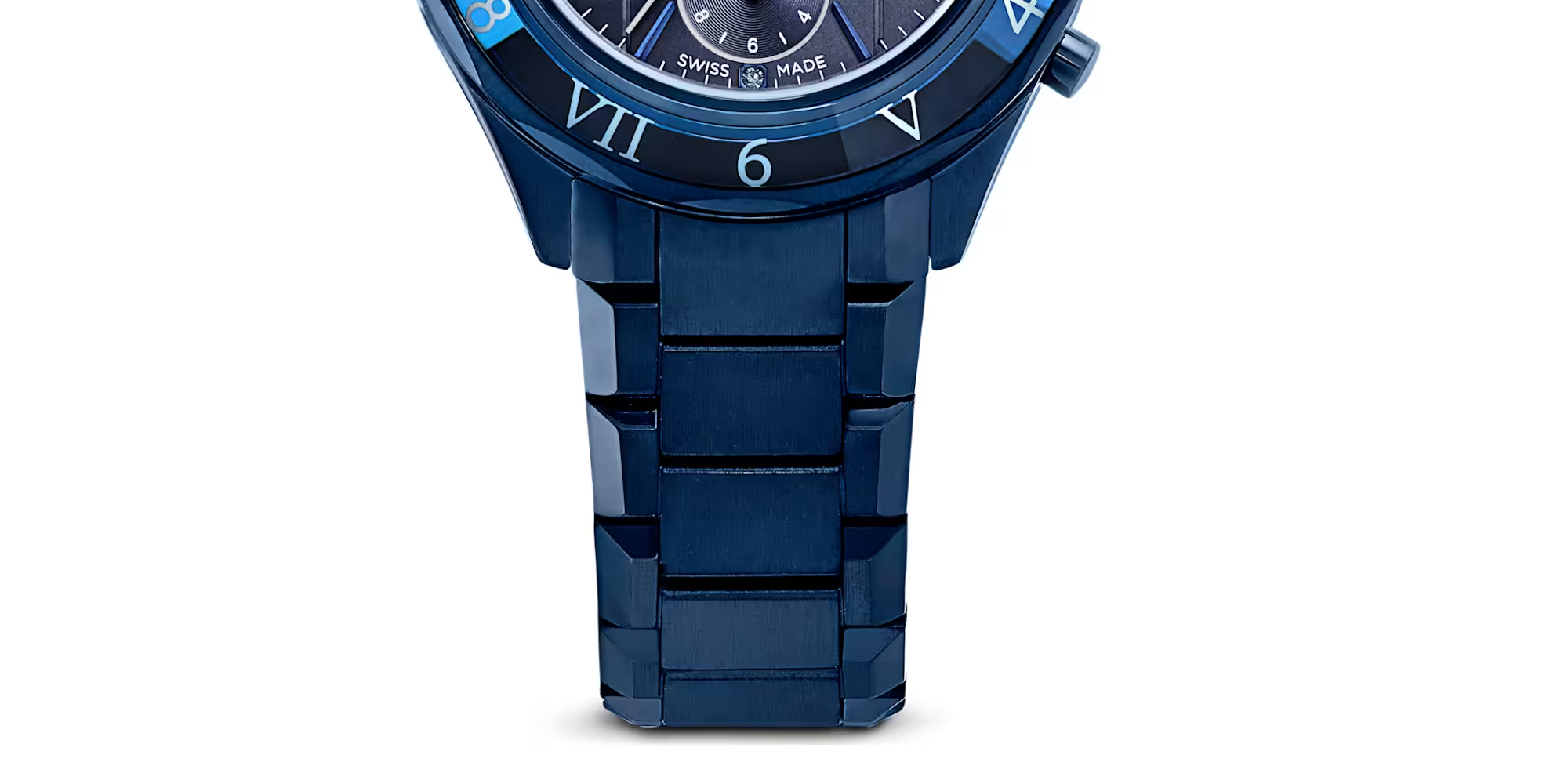 時をスタイリッシュに刻むクロノグラフ。深いブルー仕上げのファセットカットを施したステンレススチール製ケースを採用したドラマティックな40ミリの時計です。ファセットカットのブルークリスタル製ベゼルにはローマ数字とアラビア数字があしらわれ、その強烈な印象をさらに高めます。ブルーのサンレイダイヤルにはグリッドパターン、蛍光の針とインデックス、そして4つのクリスタル製アワーマーカーを配しています。優れた機能として、3つのサブダイヤルは分カウンター、秒カウンター、時カウンターを備えます。リューズにはシングルクリスタルをセットし、スイス製のこのタイムピースはブルー仕上げの3連ブレスレットと50メートルの防水性能を備えています。