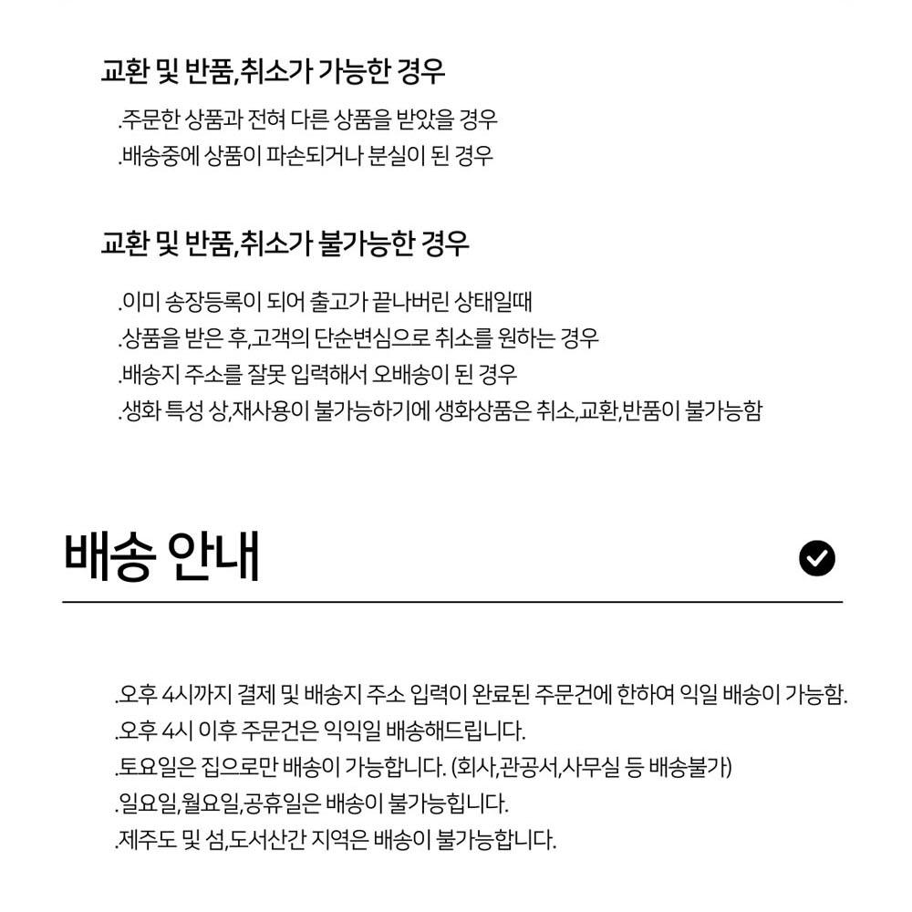 • 제주 및 도서산간 지역은 배송이 불가하여 주문이 자동 취소됩니다. 양해 부탁드립니다.