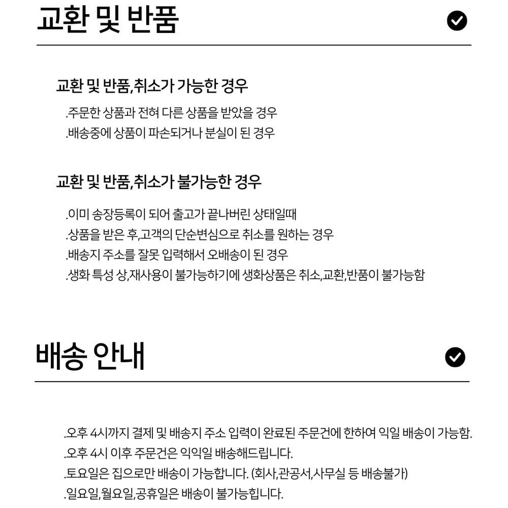 • 제주 및 도서산간 지역은 배송이 불가하여 주문이 자동 취소됩니다. 양해 부탁드립니다.