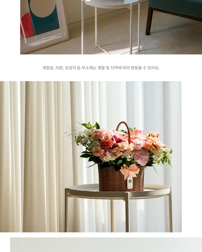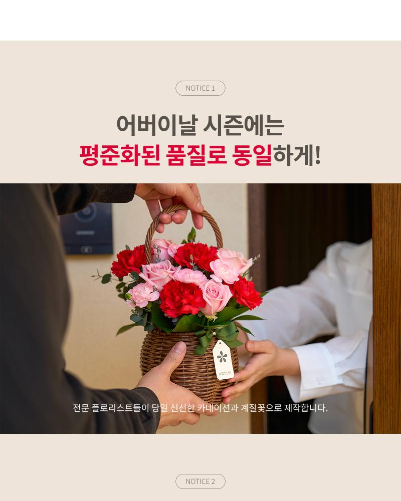 배송 불가 지역: 전라남도 곡성, 신안, 영광, 대구 군위, 경북 청송, 우도, 마라도, 제주도꽃 구성은 당일 꽃 시장 상황과 제작 여건에 따라 일부 달라질 수 있습니다. 샘플 이미지와 최대한 유사한 색감과 분위기로 제작해드리며, 화분은 재고에 따라 동일하거나 유사한 디자인으로 대체될 수 있습니다.본 상품은 주문 완료 후 영업일 2일 이내에 배송이 시작됩니다.도서산간 지역의 경우, 간혹 배송이 불가한 지역이 있습니다. 주문 후 꽃집에서 배송이 불가하다고 판단되는 경우 미리 이메일로 알려 드리겠습니다.꽃은 병원 반입이 어려워 주문 전 꼭 확인 부탁드립니다.