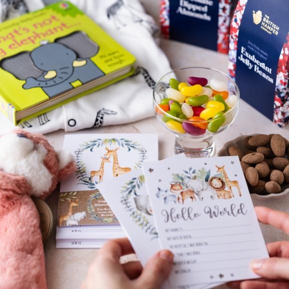 새로운 생명을 축하하며 아기와 부모를 위한 간식과 선물로 가득한 햄퍼입니다.