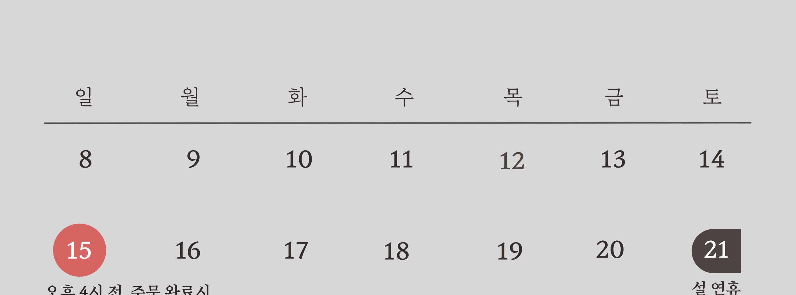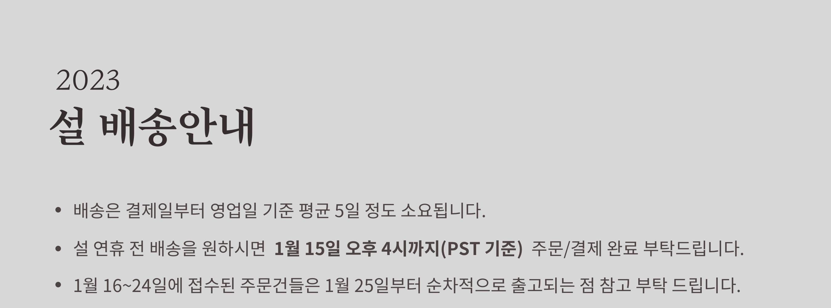 • 배송은 결제 및 배송 정보 입력 완료일로부터 영업일 기준 평균 3-5일 이내에 완료됩니다. (주말, 공휴일 제외) 주문량이 많을 경우 시간이 조금 더 소요될 수 있습니다.