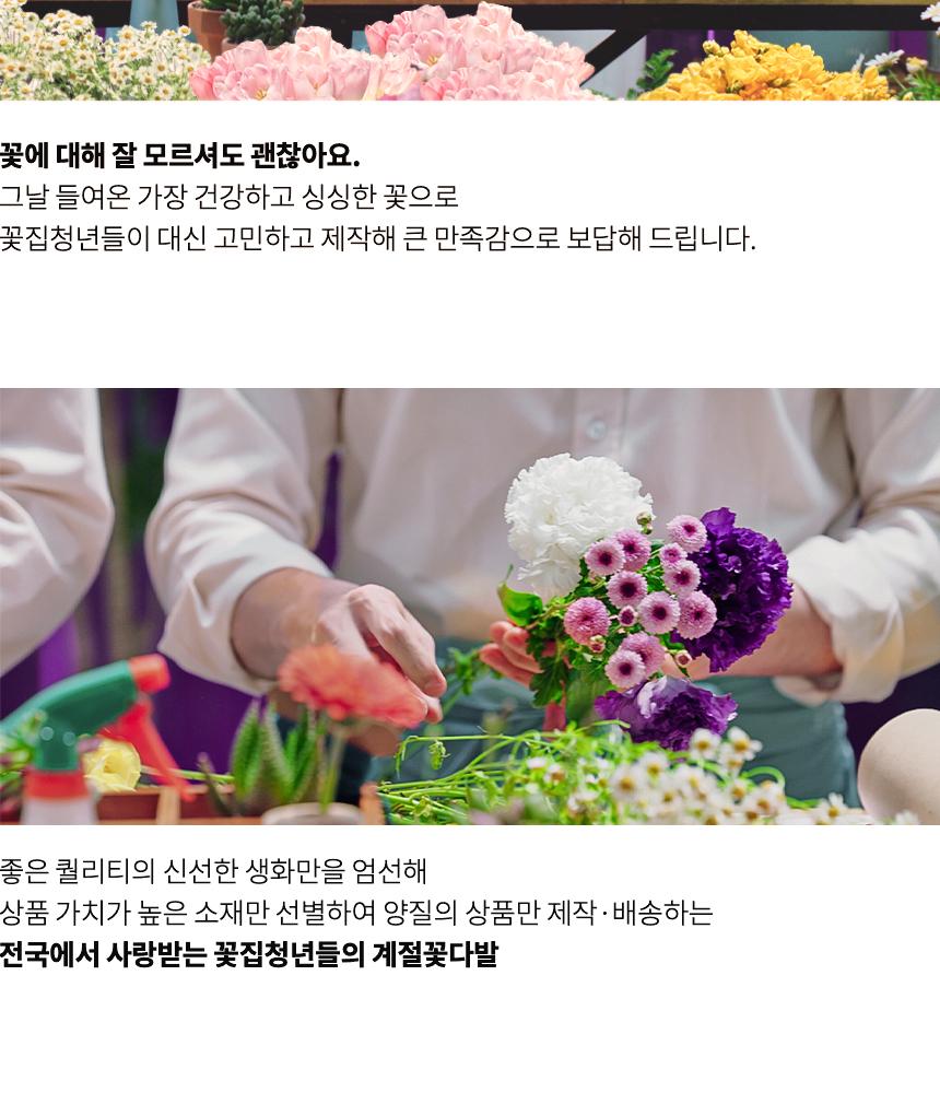 본 상품은 주문 완료 후 영업일 2일 이내에 배송이 시작됩니다.꽃 구성은 당일 꽃 시장 상황과 제작 여건에 따라 일부 달라질 수 있습니다. 샘플 이미지와 최대한 유사한 색감과 분위기로 제작해드리며, 화분은 재고에 따라 동일하거나 유사한 디자인으로 대체될 수 있습니다.배송 불가 지역: 전라남도 곡성, 신안, 영광, 대구 군위, 경북 청송, 우도, 마라도, 제주도도서산간 지역의 경우, 간혹 배송이 불가한 지역이 있습니다. 주문 후 꽃집에서 배송이 불가하다고 판단되는 경우 미리 이메일로 알려 드리겠습니다.꽃은 병원 반입이 어려워 주문 전 꼭 확인 부탁드립니다.