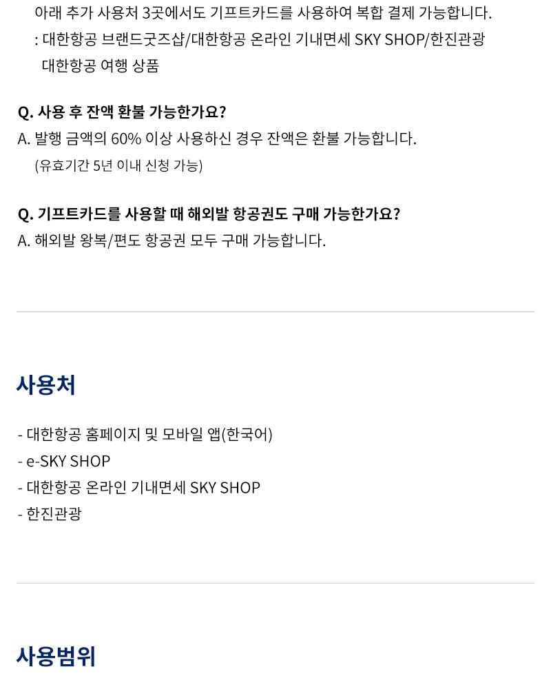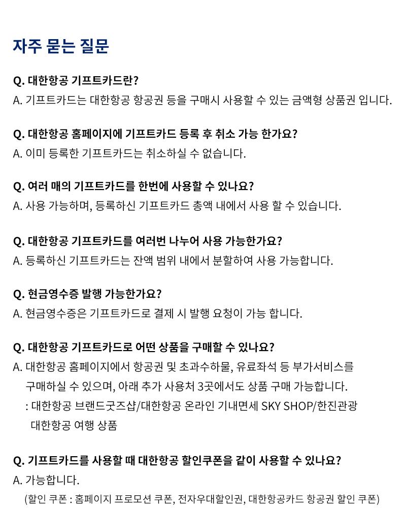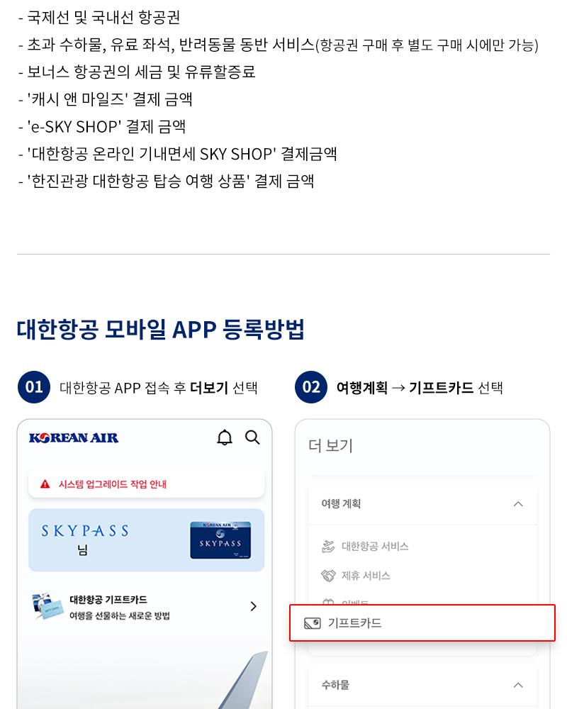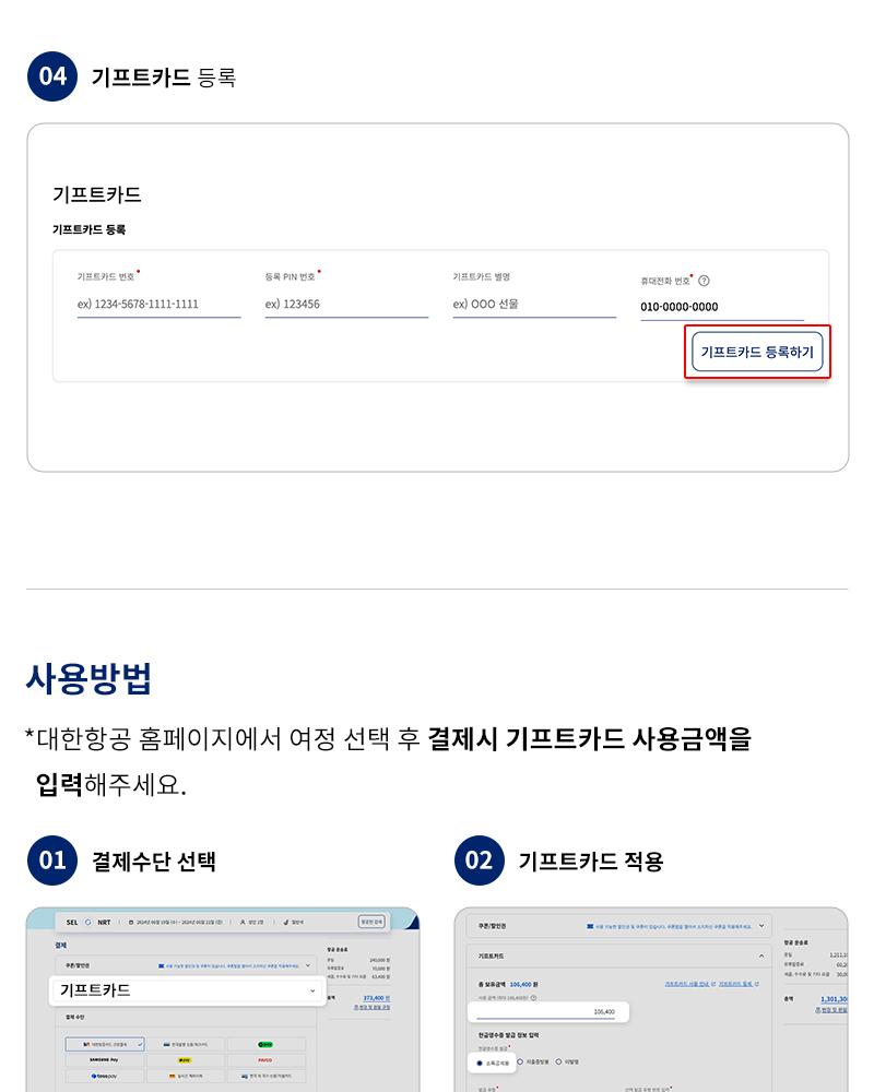 - 대한항공 홈페이지 및 모바일 앱에서 기프트카드를 등록하신 후 사용하실수 있습니다.