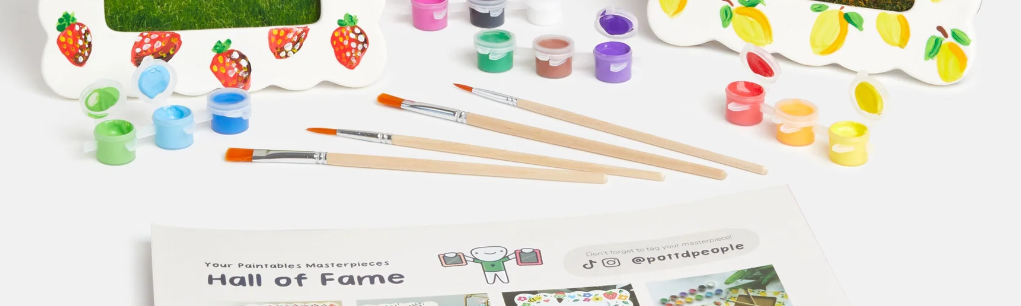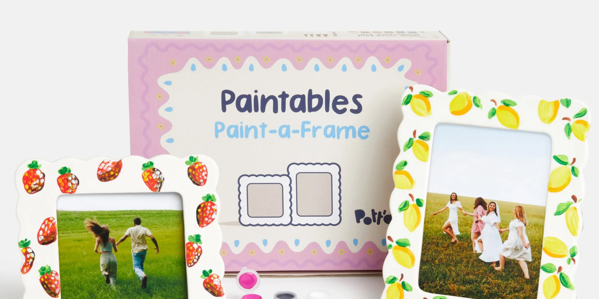 남녀노소 누구나 쉽게 즐길 수 있으며, 무한한 창의력을 펼칠 수 있는 포티드 페인트 어 프레임 세트에는 화이트 웨이브 엣지 프레임 2개(정사각형 1개, 직사각형 1개), 세라믹 물감 12색, 붓 4개, 포티드 퀵스타트 가이드가 포함되어 있습니다.