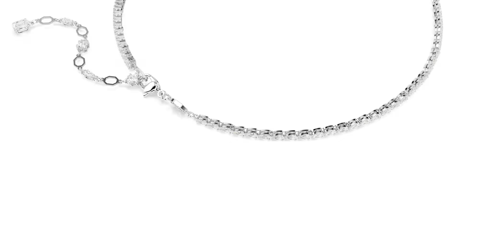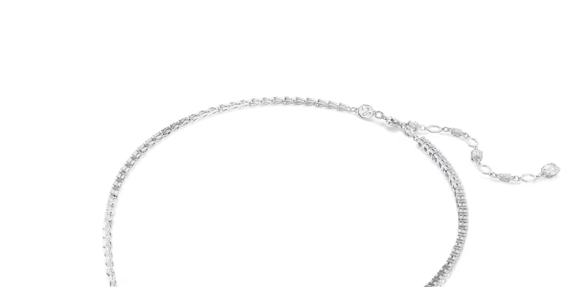 섬세한 브이 목걸이에서 세련미가 돋보입니다. 로듐 도금된 디자인에 맑은 스와로브스키 지르코니아가 눈물방울형과 사각형 컷으로 다채롭게 세팅되어, 여러 크기가 어우러져 실루엣에 예상치 못한 입체감을 더합니다. 낮과 밤을 가리지 않고 당신의 룩에 우아함을 더해 주는 눈부신 주얼리입니다.