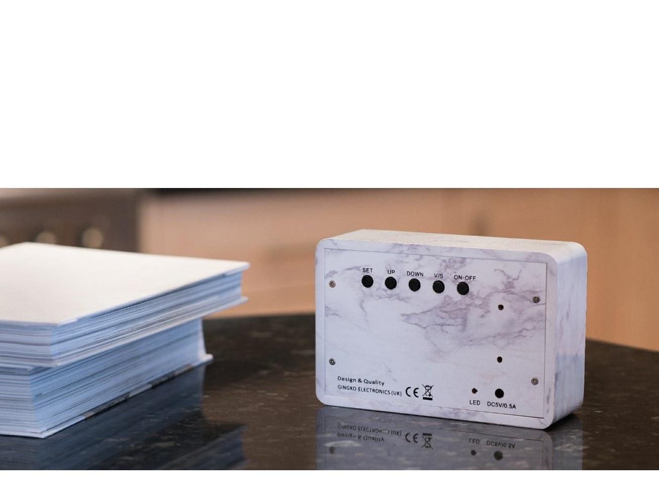 대리석 질감의 벽돌 형태에 담긴 이 브릭 클릭 클록은 손가락을 튕기면 흰색 엘이디로 시간, 날짜, 온도를 번갈아 표시하고, 방이 조용해지면 자동으로 꺼졌다가 알람이 울리거나 손가락을 튕기거나 손뼉을 치면 다시 켜진다. 숫자는 사랑스러운 나무 블록 위에 떠 있는 듯 보이지만, 그것은 양심 있는 이 벽돌이 지닌 마법의 절반에 불과하다.