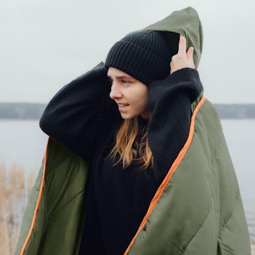 내구성이 뛰어나고 방수 기능이 있는 소재로 제작되었으며, 드로스트링 후드와 여유로운 포켓이 더해져 순식간에 완벽한 랩어라운드 담요로 변신합니다.